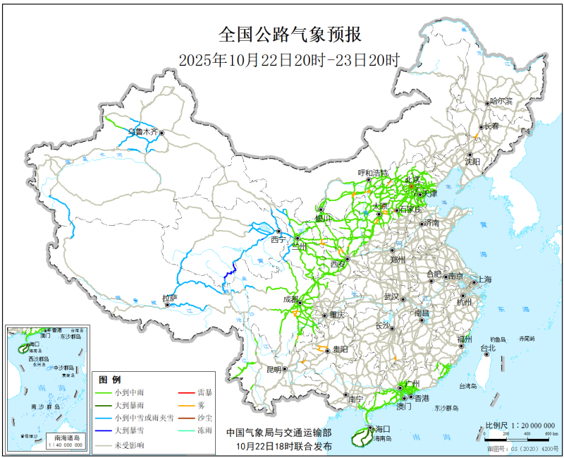 中國氣象局與交通運輸部2025年10月22日聯合發佈全國主要公路氣象預報