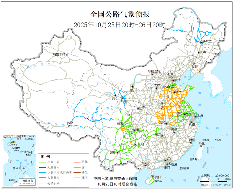 中國氣象局與交通運輸部2025年10月25日聯合發佈全國主要公路氣象預報