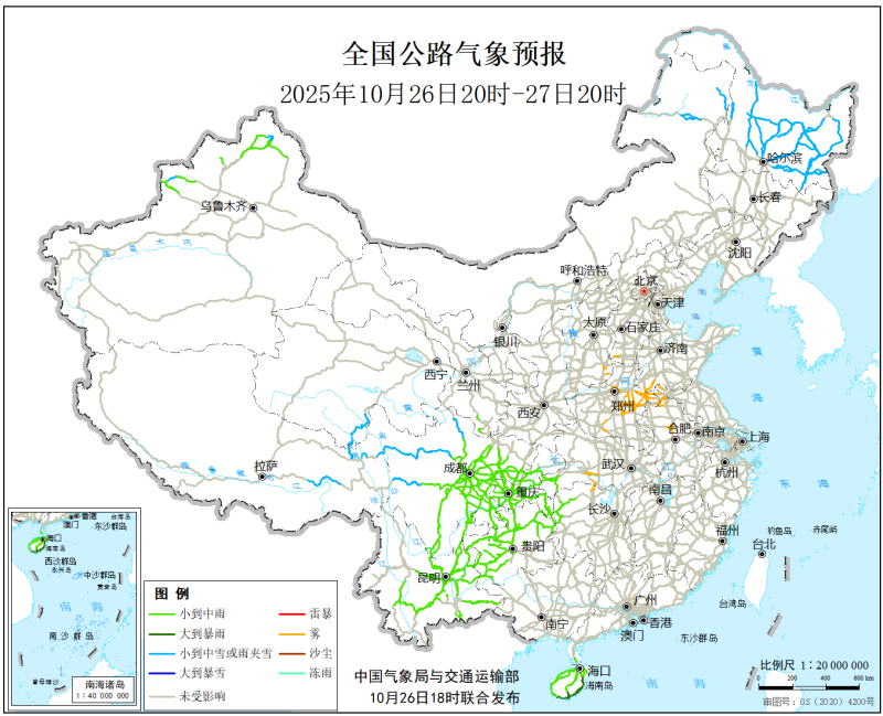 中國氣象局與交通運輸部2025年10月26日聯合發佈全國主要公路氣象預報