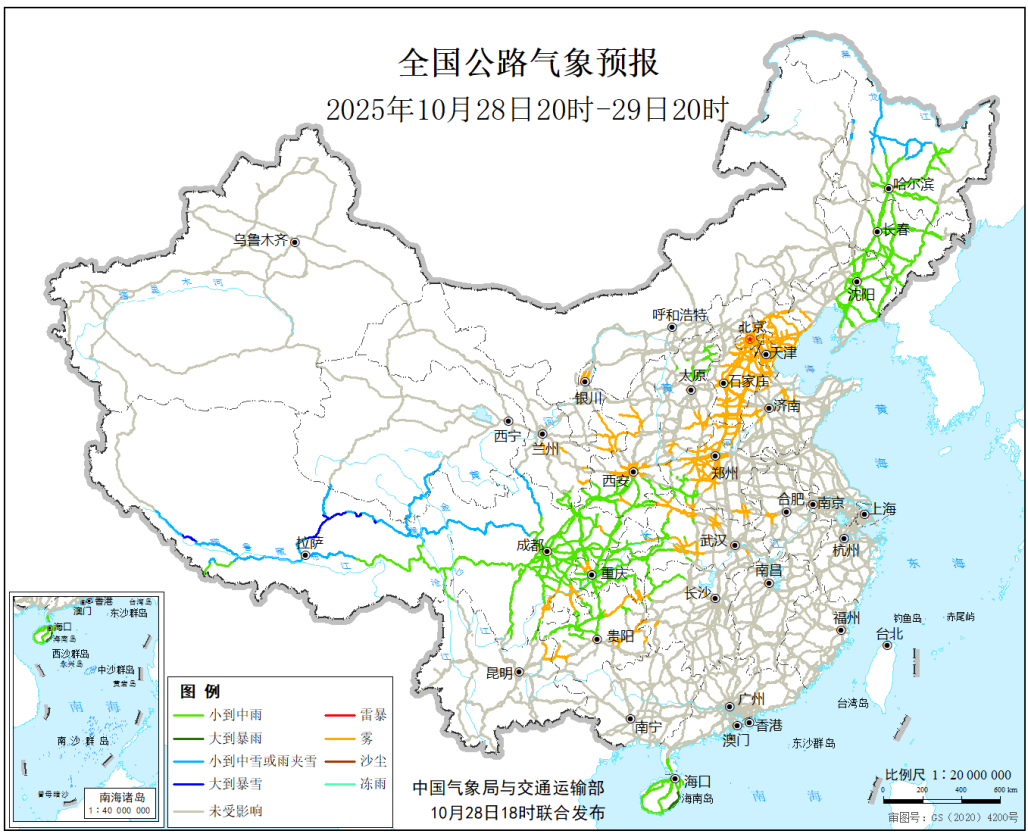 中國氣象局與交通運輸部2025年10月28日聯合發佈全國主要公路氣象預報
