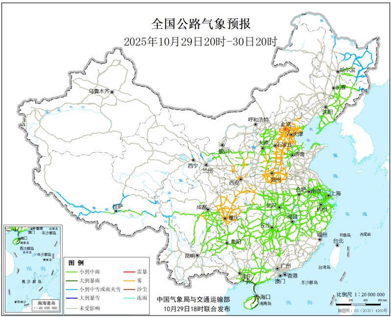 中國氣象局與交通運輸部2025年10月29日聯合發佈全國主要公路氣象預報