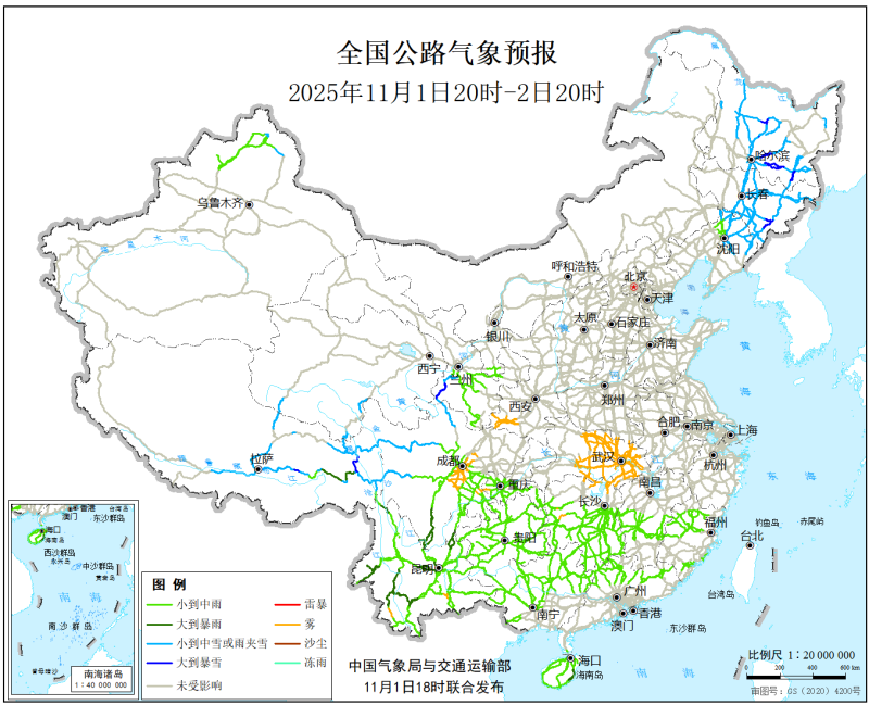 中國氣象局與交通運輸部2025年11月1日聯合發佈全國主要公路氣象預報