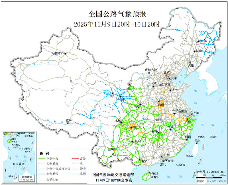中國氣象局與交通運輸部2025年11月9日聯合發佈全國主要公路氣象預報
