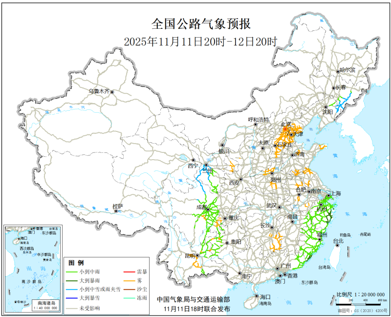 中國氣象局與交通運輸部2025年11月11日聯合發佈全國主要公路氣象預報