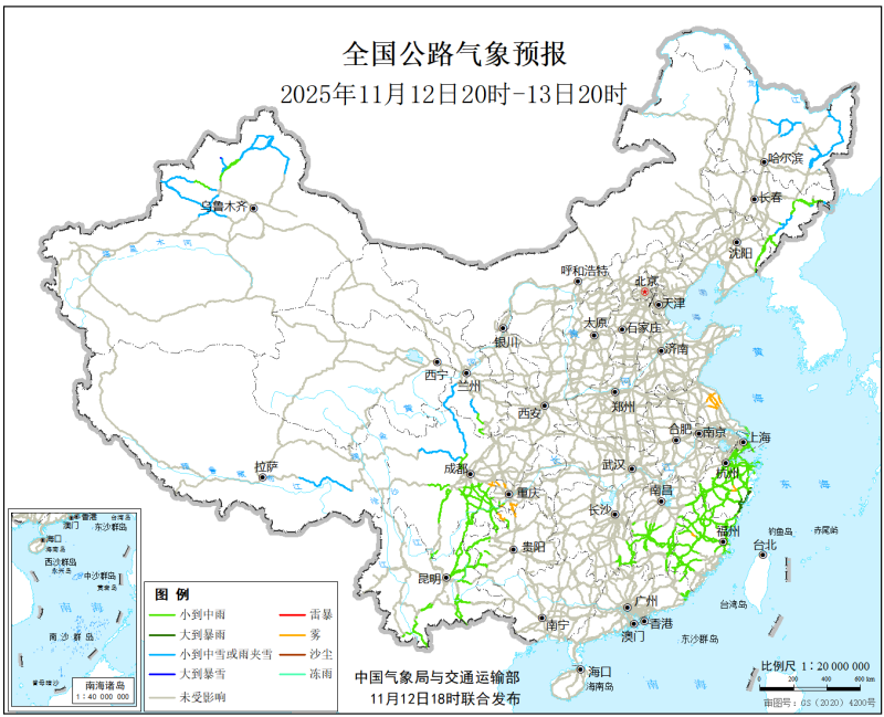 中國氣象局與交通運輸部2025年11月12日聯合發佈全國主要公路氣象預報