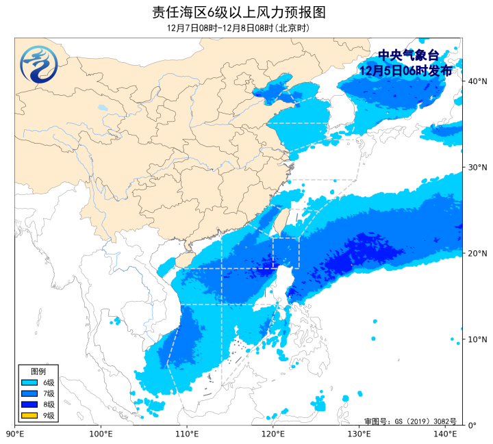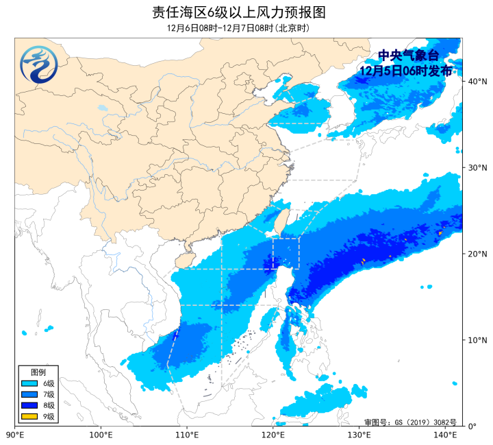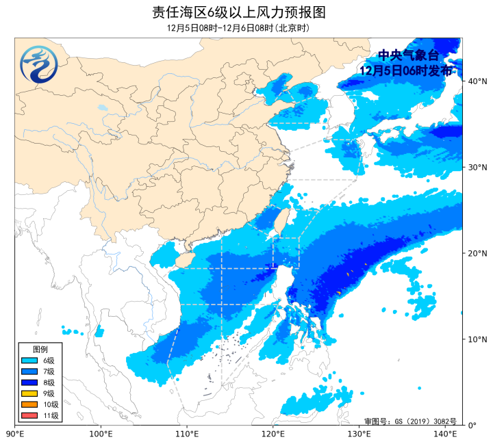 12月4日14時至5日02時,黃海北部和中部海域、東海北部海域出現了5~7級、陣風8級的西北風,黃海南部海域、台灣海峽、台灣以東洋面、巴士海峽、南海北部海域、南海中西部和南部海域出現了5~7級、陣風8級的東北風或偏北風。