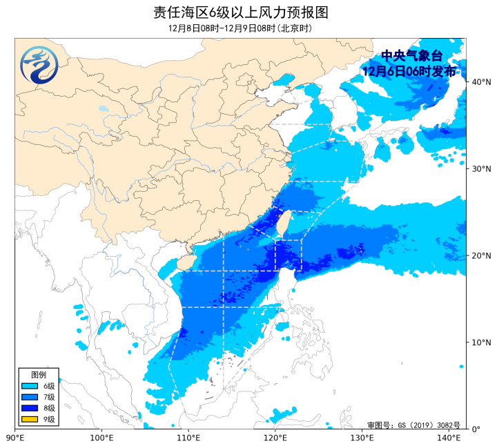 6日08時至7日08時,巴士海峽、南海東北部、中東部和南海西南部海域將有6~7級、陣風8級的偏東到東北風,渤海、渤海海峽、黃海北部和中部海域將有5~6級、陣風7級的偏西到西南風,台灣海峽、台灣以東洋面、南海西北部、中西部和南海東南部海域將有4~6級、陣風7級的偏北到東北風。