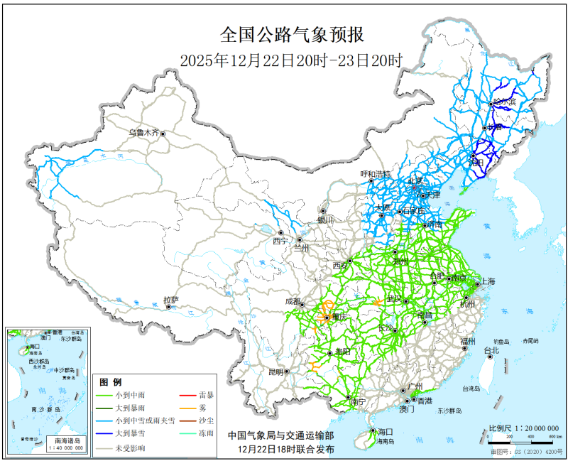 中國氣象局與交通運輸部2025年12月22日聯合發佈全國主要公路氣象預報