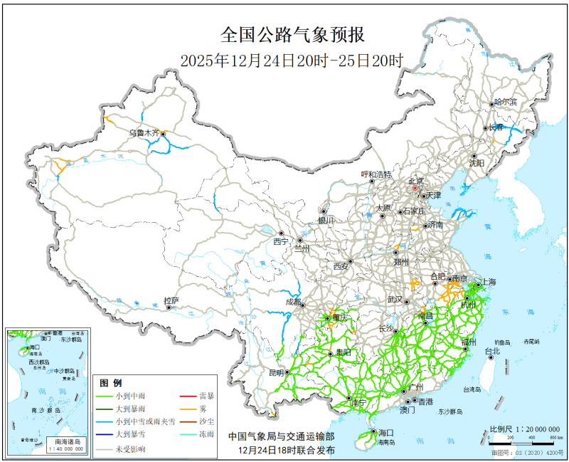 中國氣象局與交通運輸部2025年12月24日聯合發佈全國主要公路氣象預報