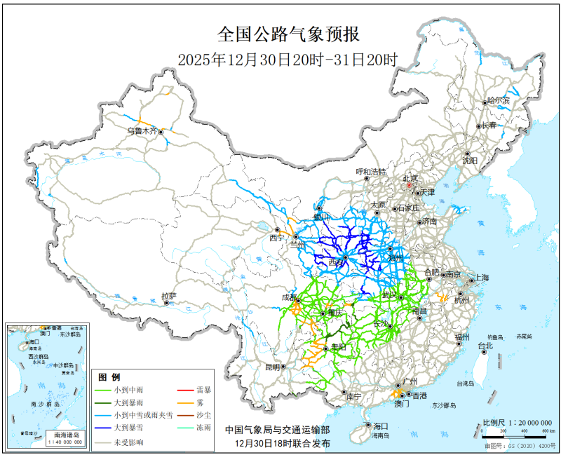 中國氣象局與交通運輸部2025年12月30日聯合發佈全國主要公路氣象預報