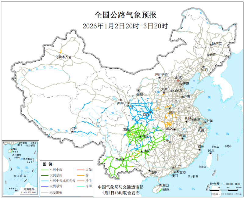 中國氣象局與交通運輸部2026年1月2日聯合發佈全國主要公路氣象預報