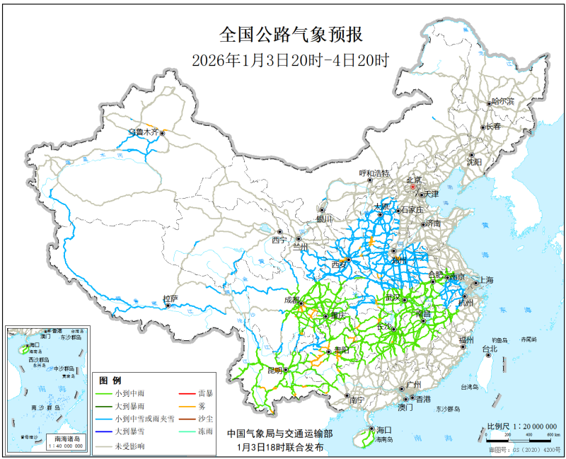 中國氣象局與交通運輸部2026年1月3日聯合發佈全國主要公路氣象預報