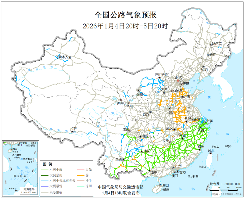 中國氣象局與交通運輸部2026年1月4日聯合發佈全國主要公路氣象預報