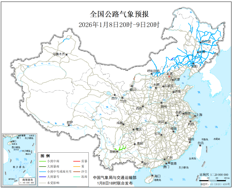中國氣象局與交通運輸部2026年1月8日聯合發佈全國主要公路氣象預報