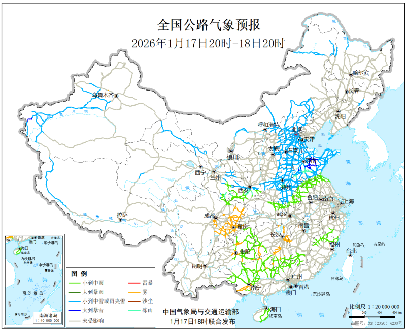 中國氣象局與交通運輸部2026年1月17日聯合發佈全國主要公路氣象預報