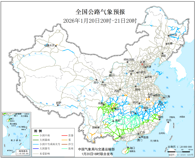 中國氣象局與交通運輸部2026年1月20日聯合發佈全國主要公路氣象預報