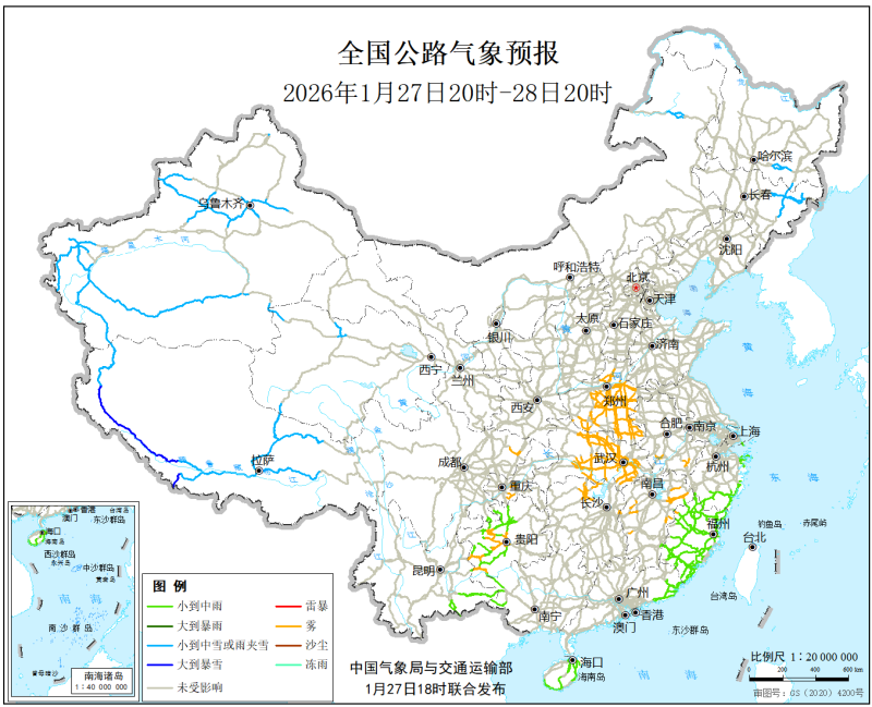 中國氣象局與交通運輸部2026年1月27日聯合發佈全國主要公路氣象預報