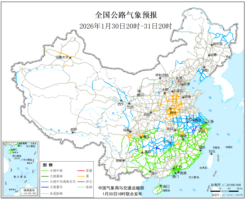 中國氣象局與交通運輸部2026年1月30日聯合發佈全國主要公路氣象預報
