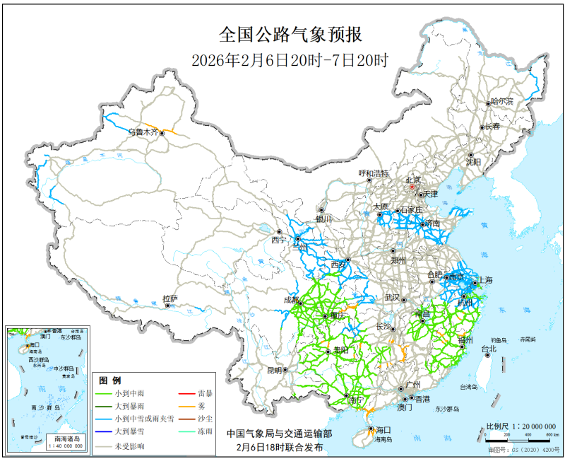 中國氣象局與交通運輸部2026年2月6日聯合發佈全國主要公路氣象預報