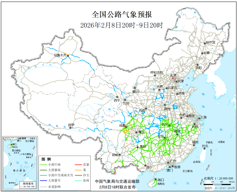 中國氣象局與交通運輸部2026年2月8日聯合發佈全國主要公路氣象預報