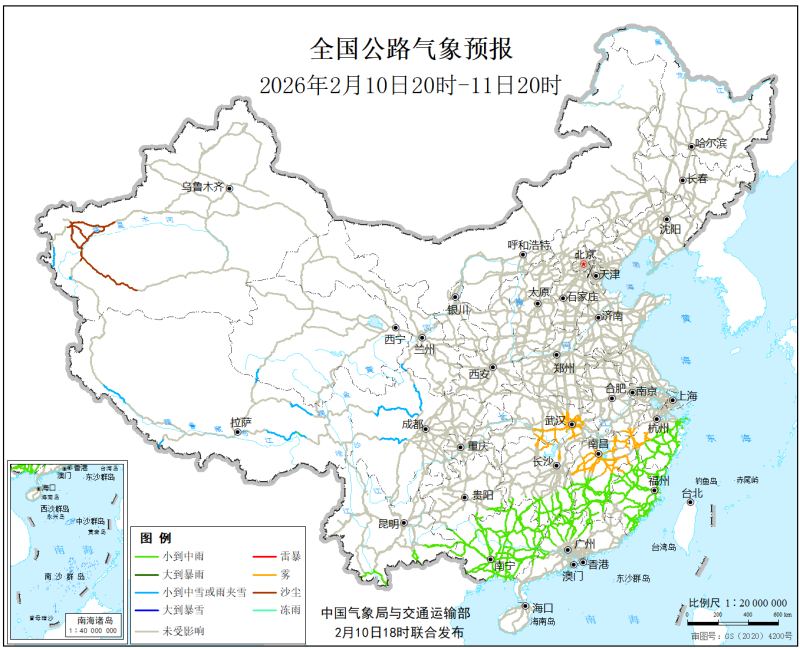 中國氣象局與交通運輸部2026年2月10日聯合發佈全國主要公路氣象預報