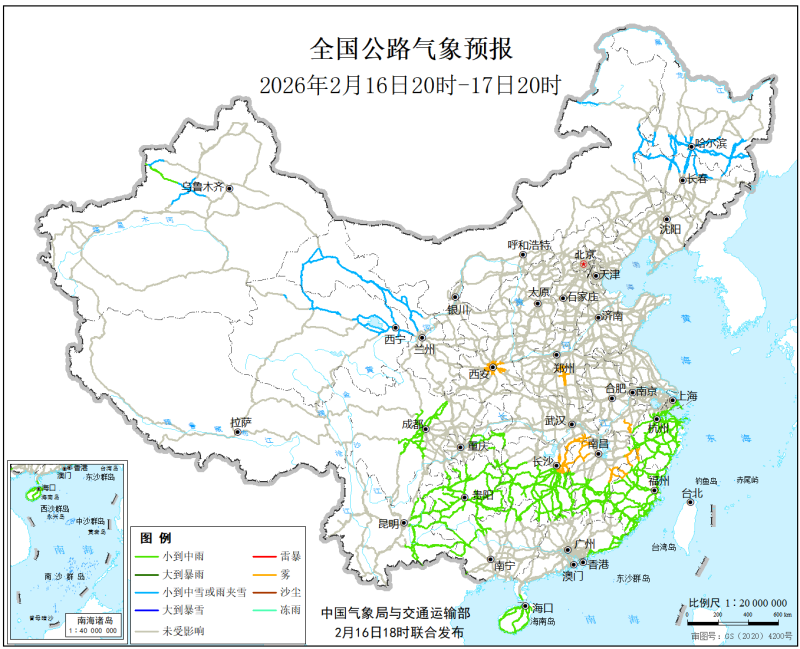 中國氣象局與交通運輸部2026年2月16日聯合發佈全國主要公路氣象預報