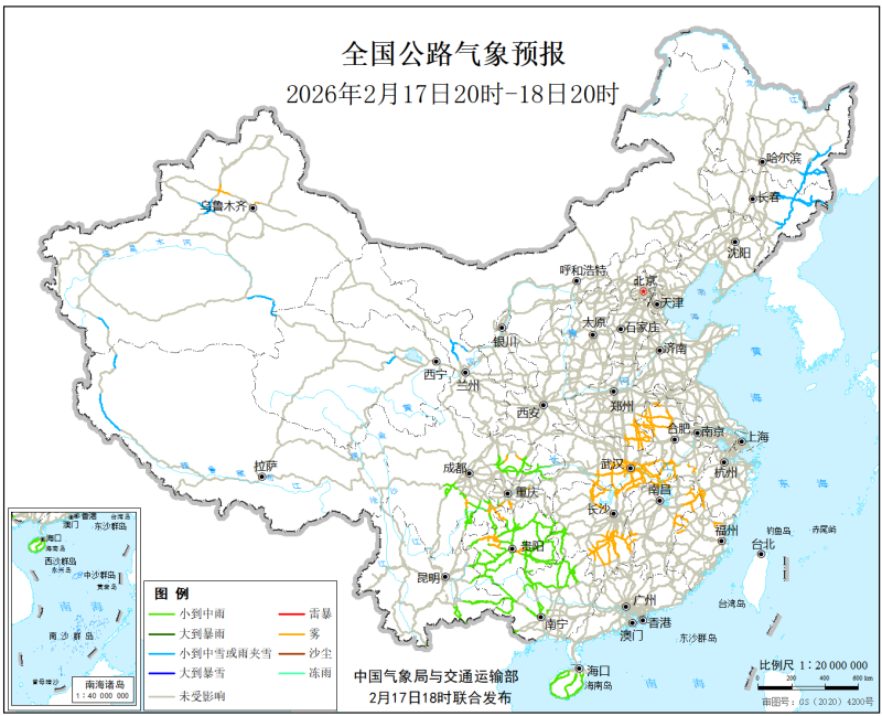 中國氣象局與交通運輸部2026年2月17日聯合發佈全國主要公路氣象預報
