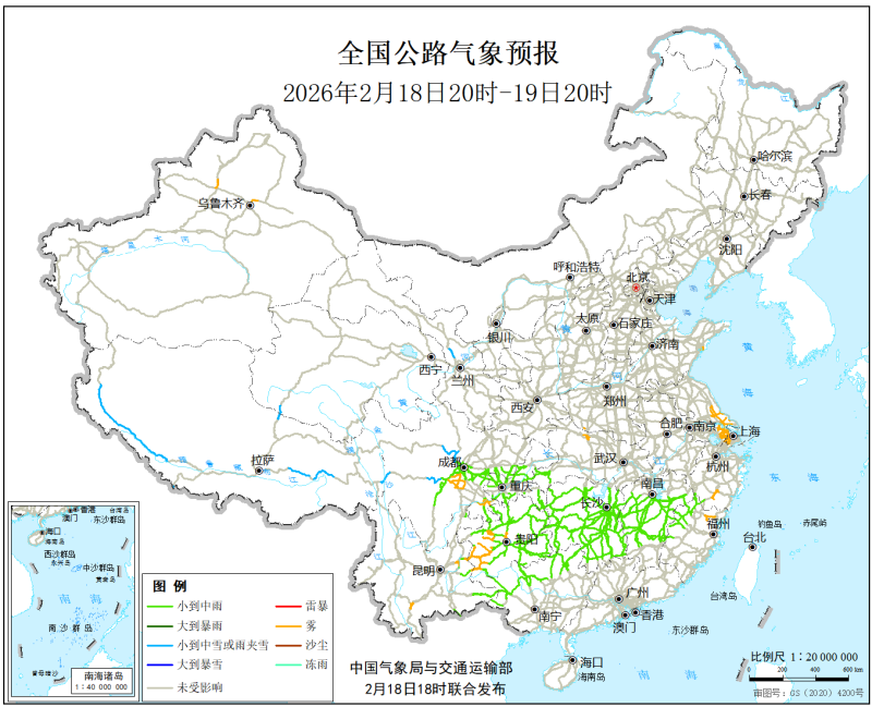 中國氣象局與交通運輸部2026年2月18日聯合發佈全國主要公路氣象預報