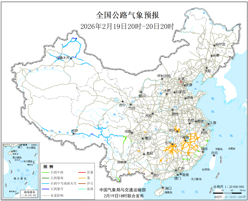 中國氣象局與交通運輸部2026年2月19日聯合發佈全國主要公路氣象預報