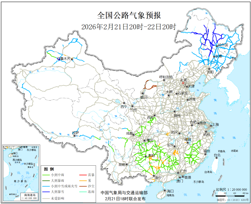 中國氣象局與交通運輸部2026年2月21日聯合發佈全國主要公路氣象預報