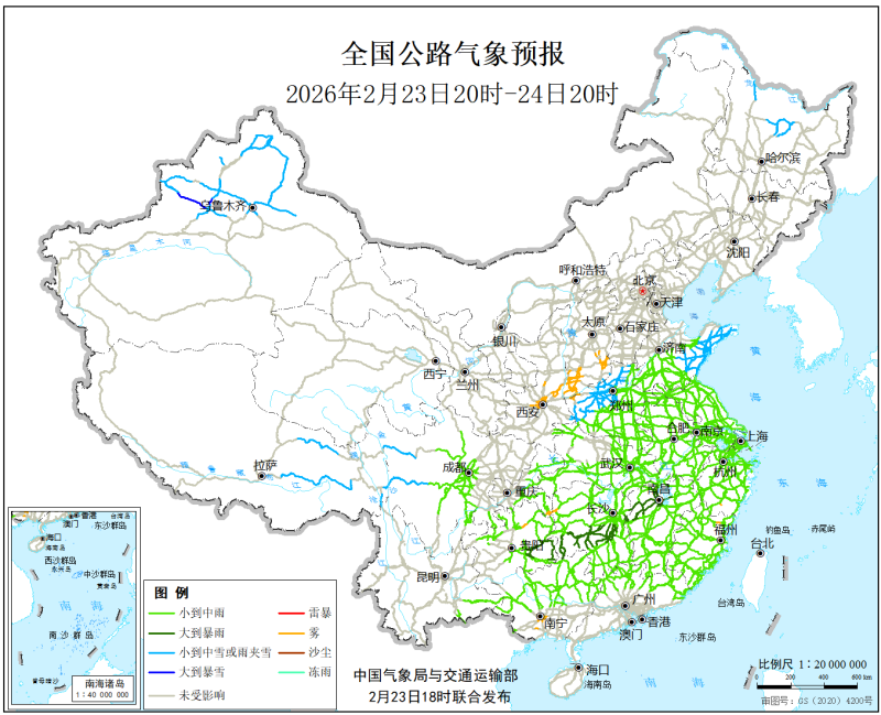 中國氣象局與交通運輸部2026年2月23日聯合發佈全國主要公路氣象預報