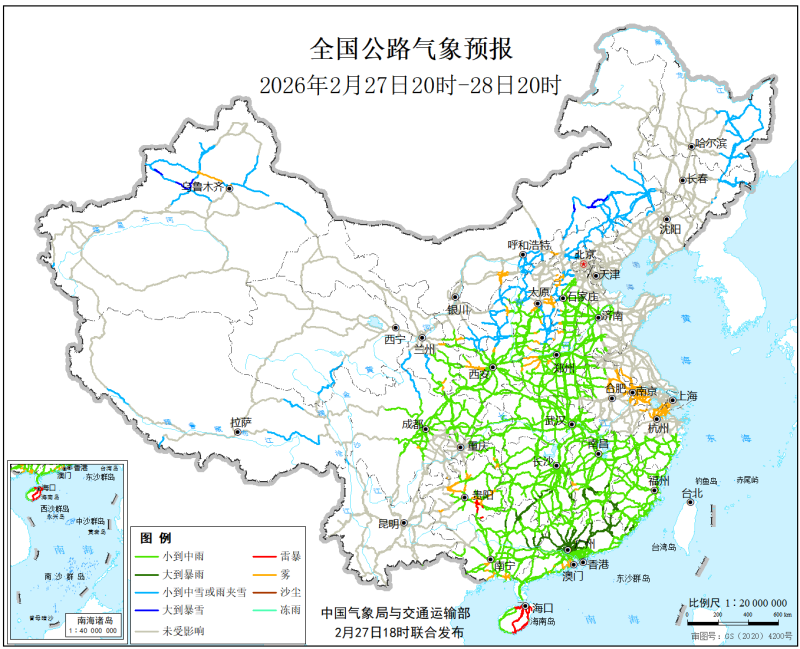 中國氣象局與交通運輸部2026年2月27日聯合發佈全國主要公路氣象預報