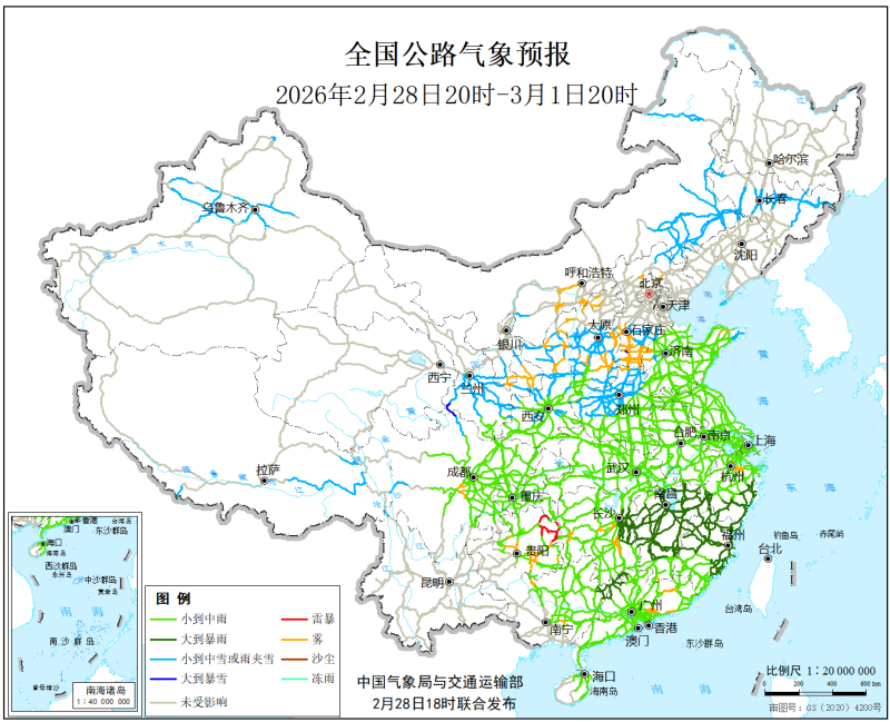 中國氣象局與交通運輸部2026年2月28日聯合發佈全國主要公路氣象預報