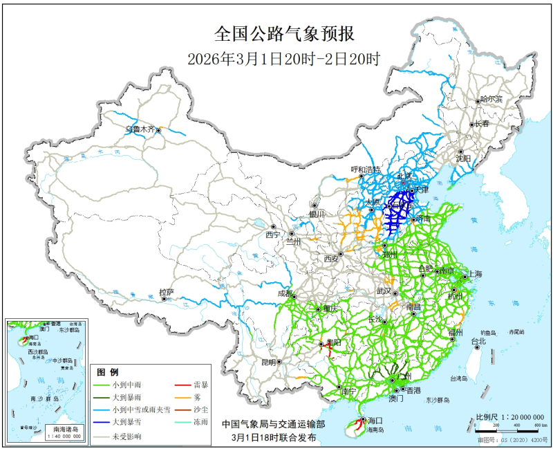 中國氣象局與交通運輸部2026年3月1日聯合發佈全國主要公路氣象預報