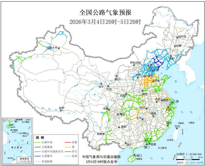 中國氣象局與交通運輸部2026年3月4日聯合發佈全國主要公路氣象預報