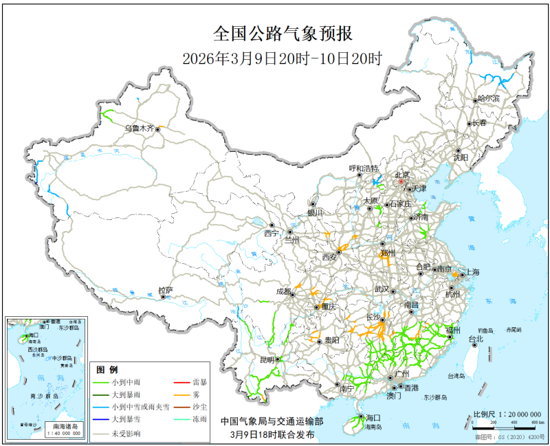 中國氣象局與交通運輸部2026年3月9日聯合發佈全國主要公路氣象預報