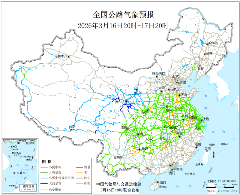 中國氣象局與交通運輸部2026年3月16日聯合發佈全國主要公路氣象預報