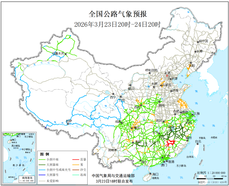 中國氣象局與交通運輸部2026年3月23日聯合發佈全國主要公路氣象預報