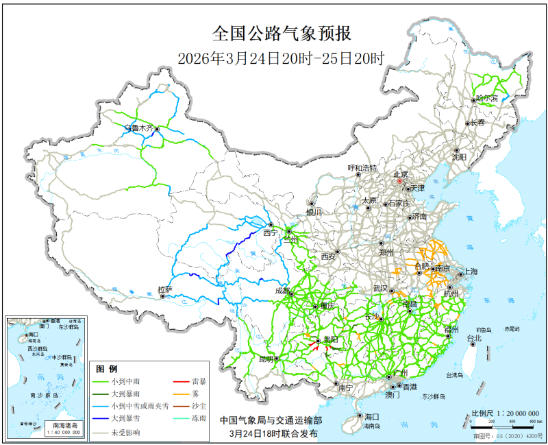 中國氣象局與交通運輸部2026年3月24日聯合發佈全國主要公路氣象預報
