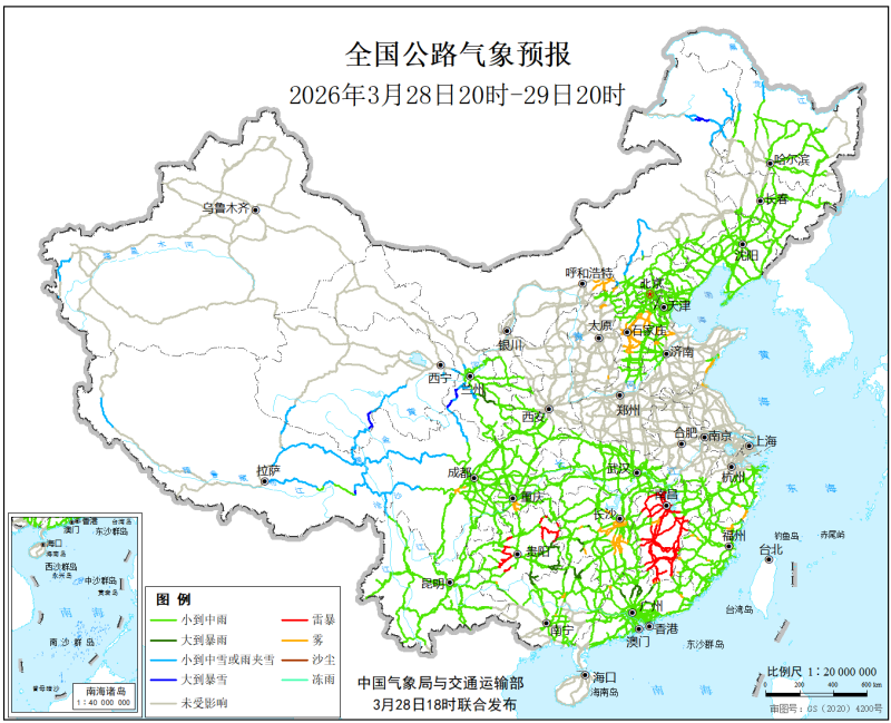 中國氣象局與交通運輸部2026年3月28日聯合發佈全國主要公路氣象預報