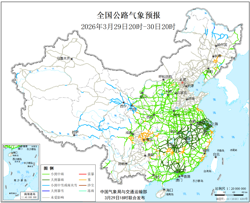 中國氣象局與交通運輸部2026年3月29日聯合發佈全國主要公路氣象預報