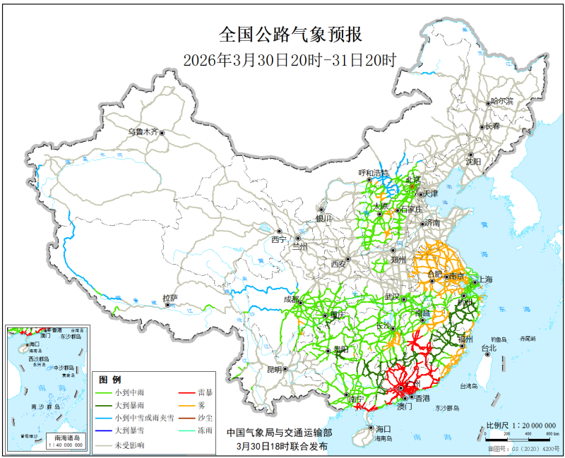 中國氣象局與交通運輸部2026年3月30日聯合發佈全國主要公路氣象預報