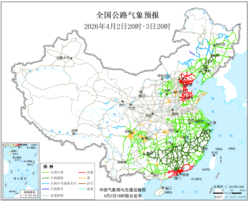 中國氣象局與交通運輸部2026年4月2日聯合發佈全國主要公路氣象預報