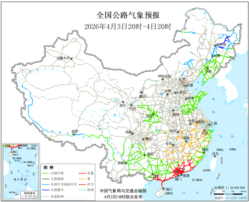 中國氣象局與交通運輸部2026年4月3日聯合發佈全國主要公路氣象預報