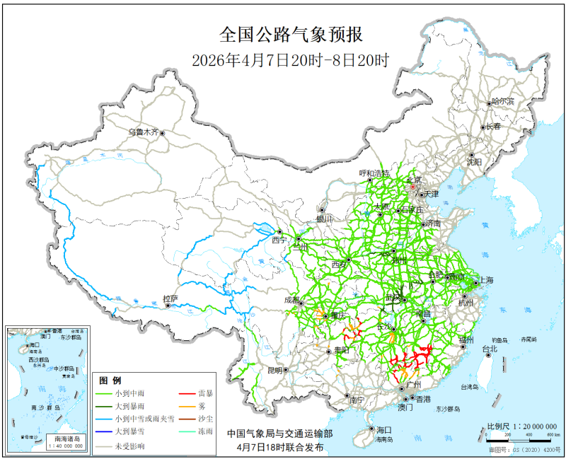 中國氣象局與交通運輸部2026年4月7日聯合發佈全國主要公路氣象預報