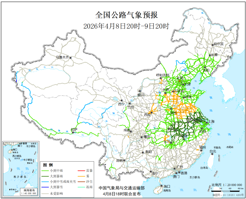 中國氣象局與交通運輸部2026年4月8日聯合發佈全國主要公路氣象預報