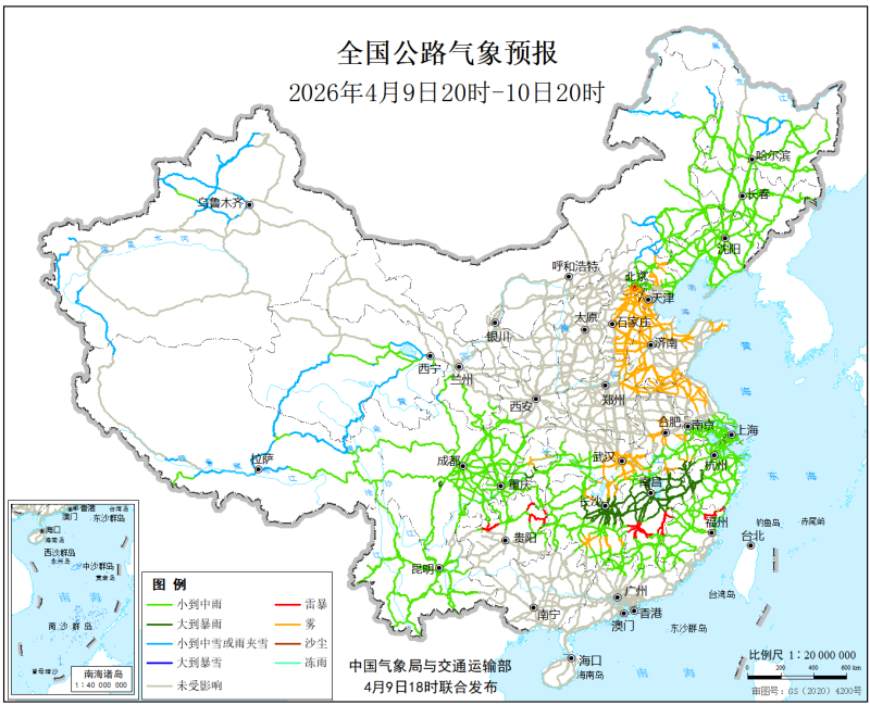 中國氣象局與交通運輸部2026年4月9日聯合發佈全國主要公路氣象預報
