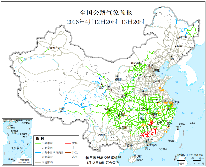 中國氣象局與交通運輸部2026年4月12日聯合發佈全國主要公路氣象預報