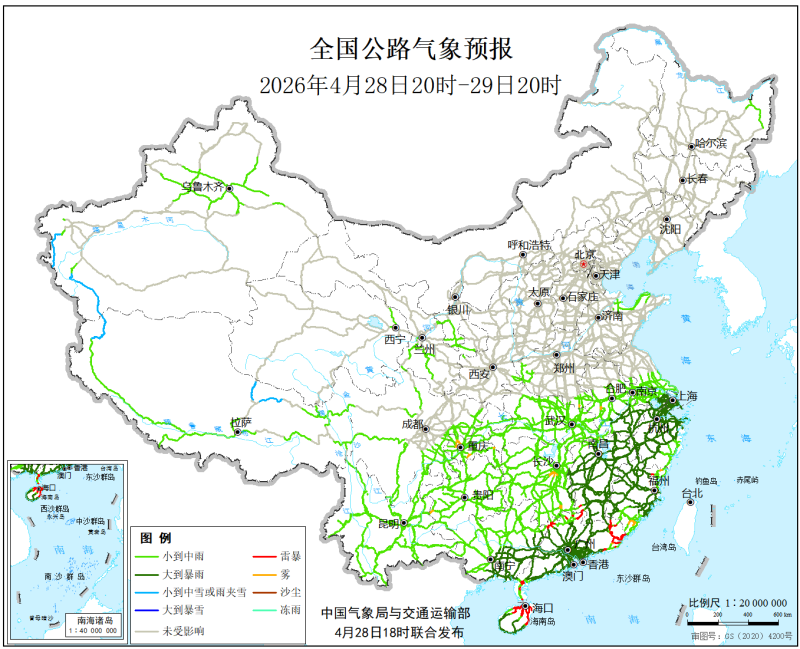 中國氣象局與交通運輸部2026年4月28日聯合發佈全國主要公路氣象預報
