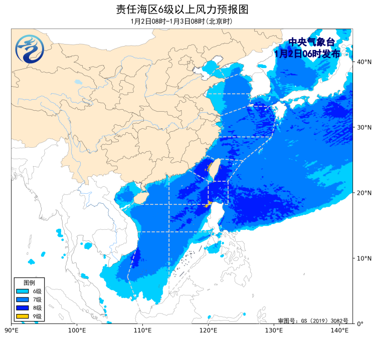 2日08時至3日08時,黃海大部海域、東海、台灣海峽、台灣以東洋面、巴士海峽、南海大部海域將有7~8級、陣風9~10級的大風,其中台灣海峽、巴士海峽部分海域風力可達9級、陣風10~11級,北部灣將有7級、陣風8級的大風。